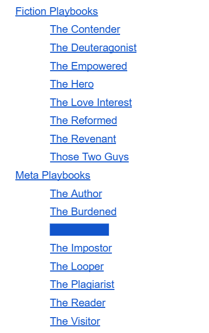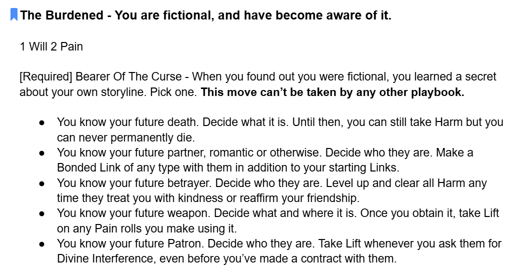 In MetaFiction, you will make a character who is either Fiction (a character within the story, who does not know their world is fictional), or Meta (characters who can perceive a layer of artifice to the world that others cannot). Each playbook has a unique and powerful Story Move that can be used once per session, and cannot be taken by any other playbook. Each player will also make a Celestial Patron, a secondary character overseeing the fictional universe who can provide mechanical and narrative boons to other player characters.